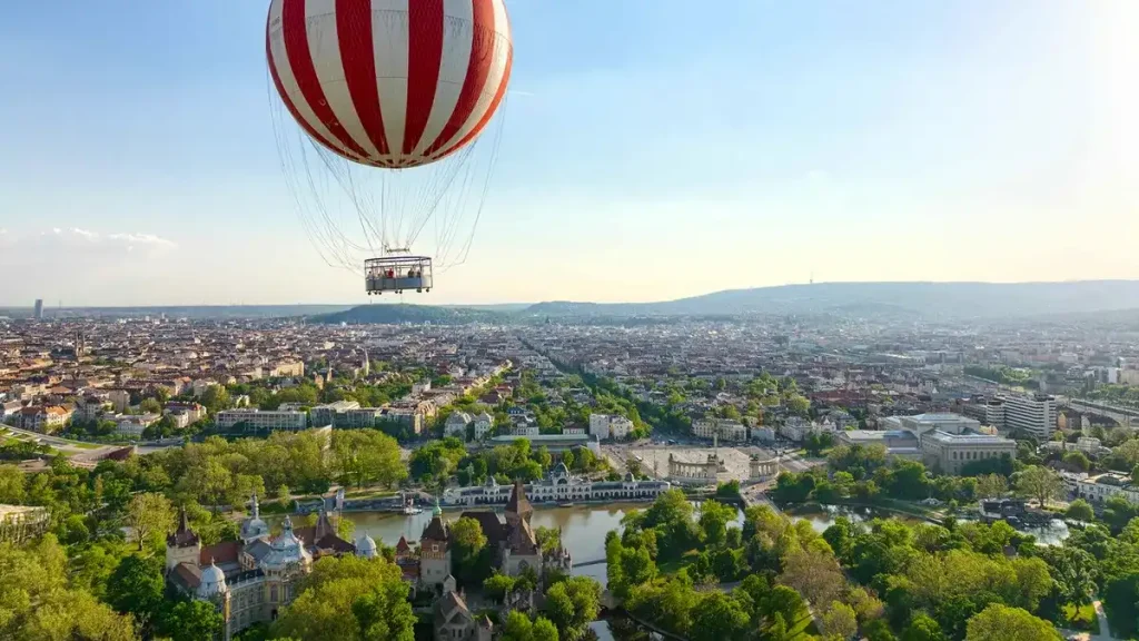 BalloonFly is located in Budapest, in Városliget, opposite the Széchenyi Thermal Bath, behind Heroes’ Square and Vajdahunyad Castle. The point of departure and return is Mimóza Hill, a small hillock designed to be a lookout point when the Ballon Captif was tethered here during the Hungarian Millennial celebrations of 1896. Its basket accommodates 30 people, who can enjoy the stunning panorama of the Városliget and Budapest from a height of 150 meters. Passengers will reach the maximum height in about five minutes, spend about the same amount of time aloft, then return the surface in five minutes. In clear weather, a bird’s-eye view will open up to visitors over all of Budapest and its environs from this height.
